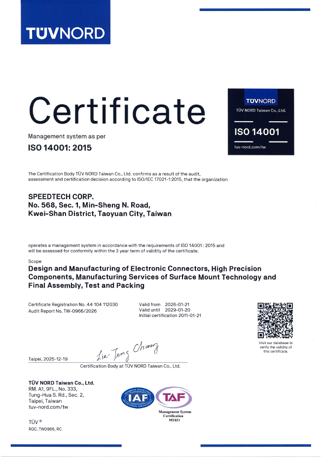 Our company guarantees that all products sold to Speedtech Co., Ltd. and its subsidiaries (hereinafter collectively referred to as "Speedtech") do not contain conflict minerals. We will conduct thorough and careful investigations into the use of Gold (Au), Tungsten (W), Tantalum (Ta), Tin (Sn), Cobalt (Co), Mica, Copper (Cu), lithium (Li), Nickel (Ni), and Graphite in our supply chain to ensure whether the origins are from Conflict-Affected and High-Risk Area (CAHRA) or illegal smuggling channels; meanwhile, manage and monitor in compliance with OECD Guidance and RBA latest standard, and continued to monitor the supply chain to improve and enhance the company's social image and value, as a socially, environmentally responsible company, continuously protect the entire supply chain of human rights, labour conditions and environmental responsibility.